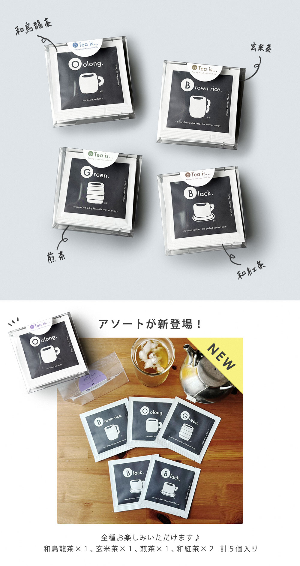 | ラインナップ | Oolong. <和烏龍茶> / Brown rice. <玄米茶> / Green.<煎茶> / Black.<和紅茶> / アソート(和烏龍茶×1、玄米茶×1、煎茶×1、和紅茶×2)