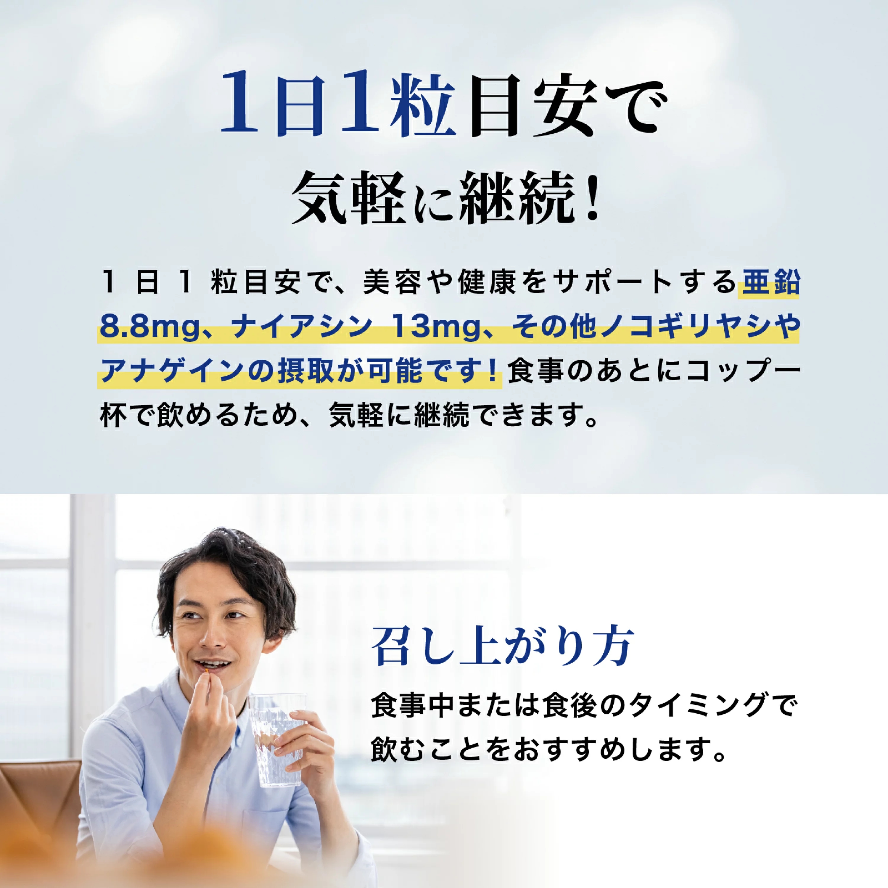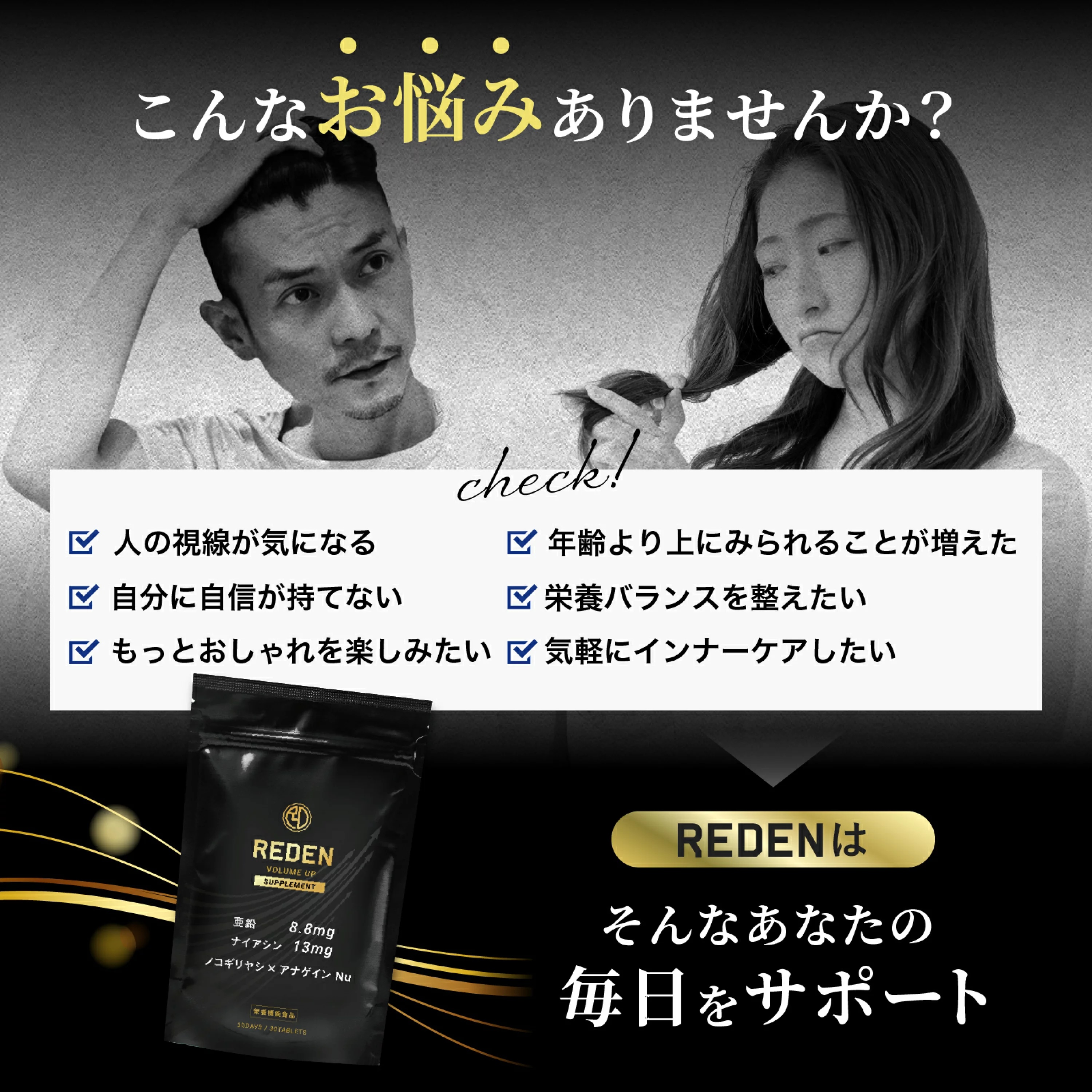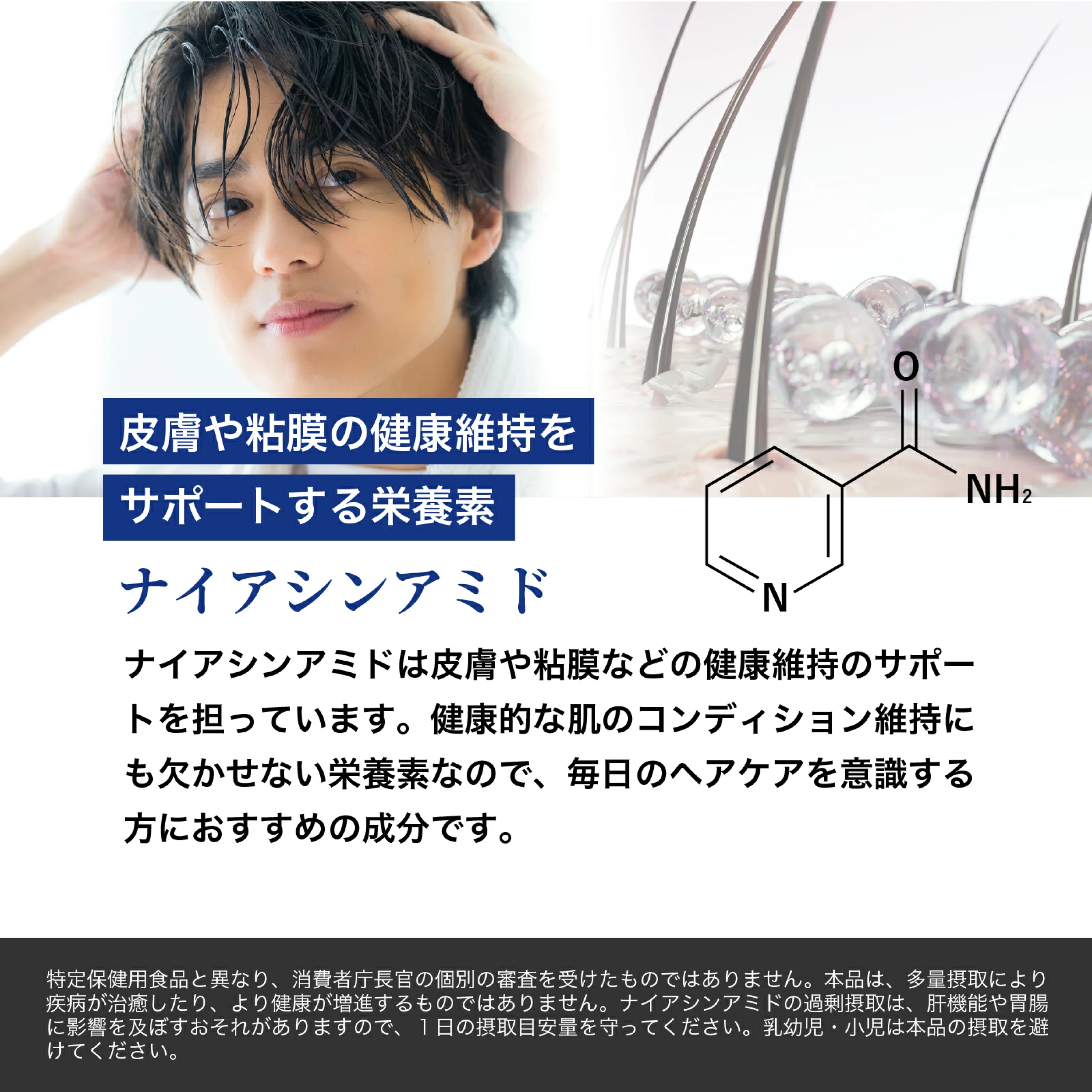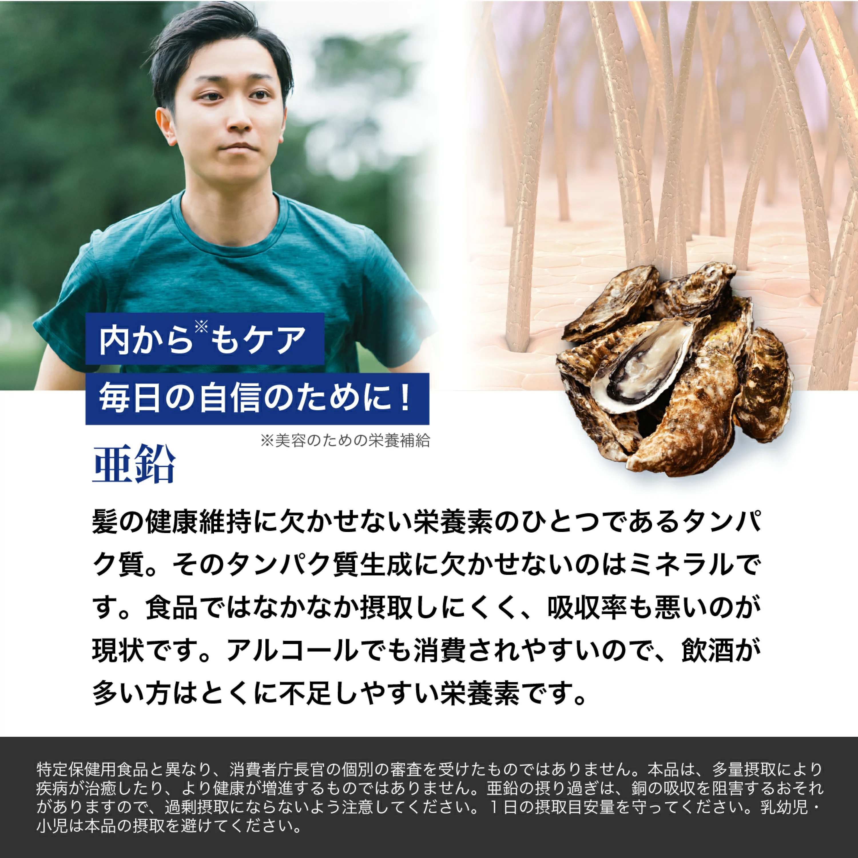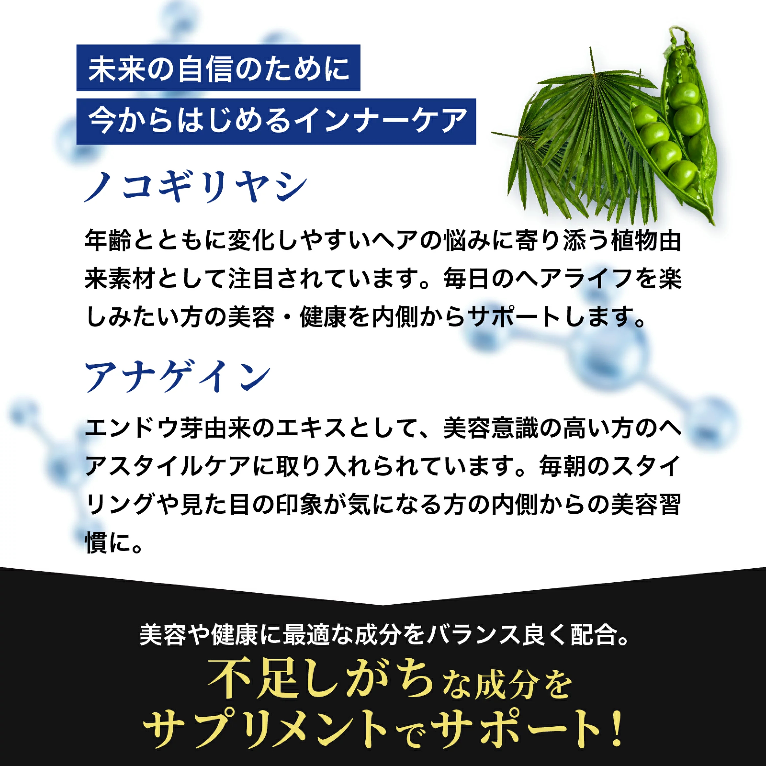 エンドウ芽エキス末(イソマルト、エンドウ芽エキス)(スイス製造)、還元麦芽糖水飴、デキストリン、ケラチン加水分解物、黒胡椒抽出物、ブロッコリースプラウト末、コラーゲンペプチド、ノニエキス末、コエンザイムQ10、ヒハツエキス末、L-シトルリン、キビ種子抽出物、ノコギリヤシエキス末/グルコン酸亜鉛、セルロース、ナイアシン、ステアリン酸カルシウム、二酸化ケイ素、ビタミンB1、増粘剤(アラビアガム)