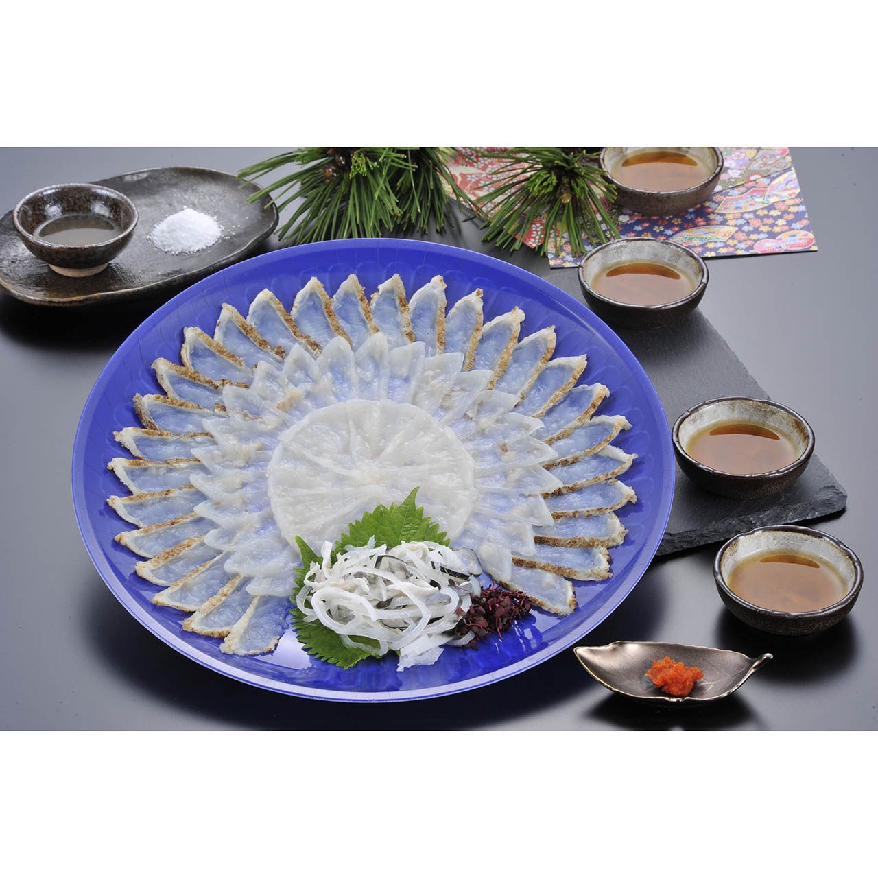 ●セット内容/まふく炙り刺身75g、とらふく刺身40g、とらふく刺身古式引き20g、とらふく皮30g、プラスチック皿30cm、ポン酢35g×2、モミジオロシ16g、塩5g、カボス果汁2ml×4※刺身皿のデザインは変わる場合がございます。