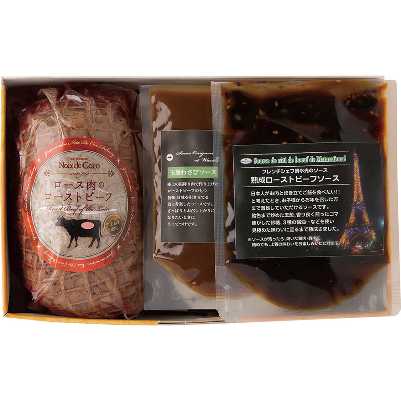 黒毛和牛ローストビーフでベストお取り寄せ大賞殿堂入りを果たした「ノワ・ド・ココ 清水シェフ」がプロデュースする『黒毛和牛A4ランクロースのローストビーフ』。メディアなどでも絶賛されたノワドココのプレシャス商品。シェフ自慢の2種類のソースでお楽しみください。