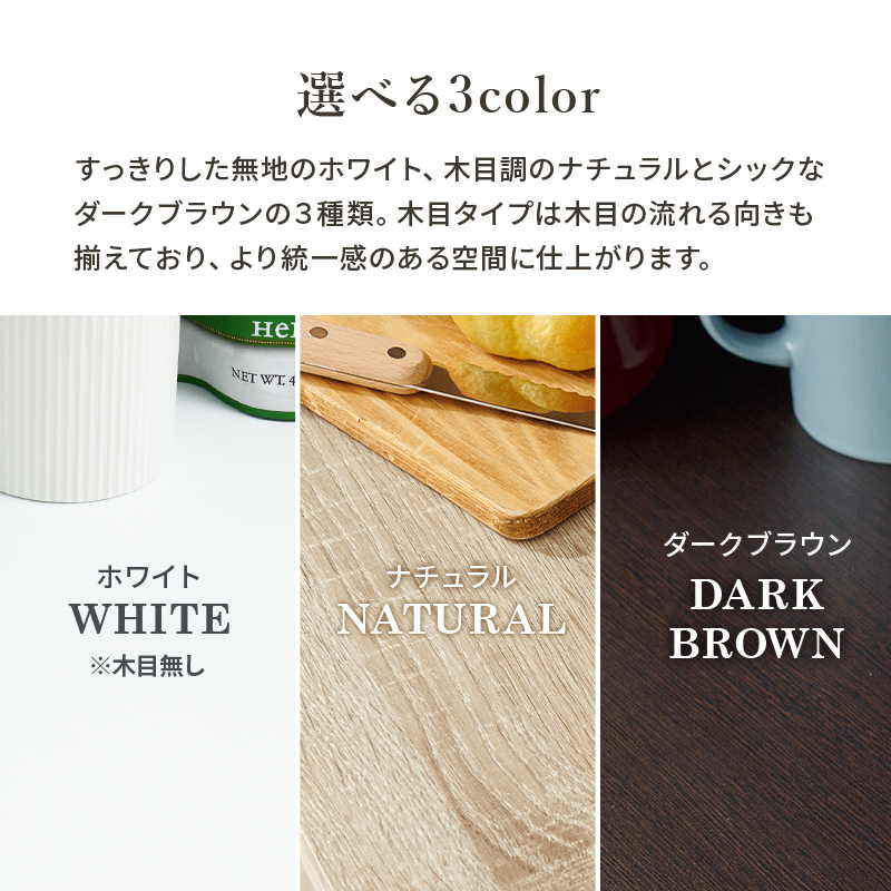 主材:プリント紙化粧パーティクルボード、天板・スライド棚:合成樹脂化粧パーティクルボード(メラミン樹脂)、取手:スチール