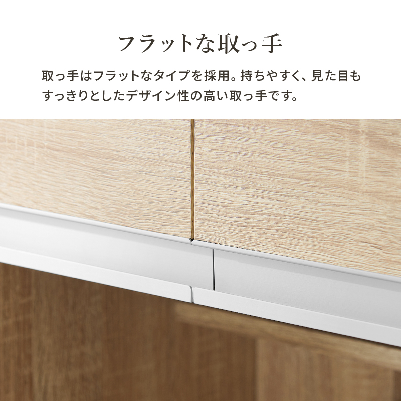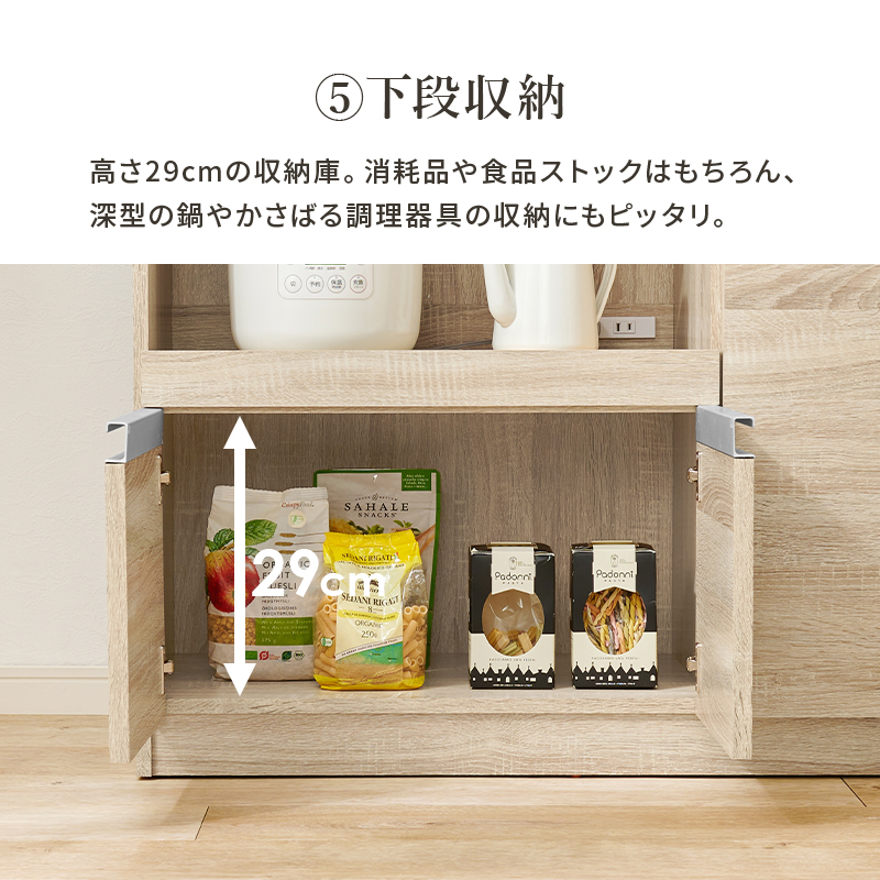 立って作業がしやすい天板高さのカウンターキャビネット。食器や調理器具、キッチン家電がスッキリ片付く大容量収納です。