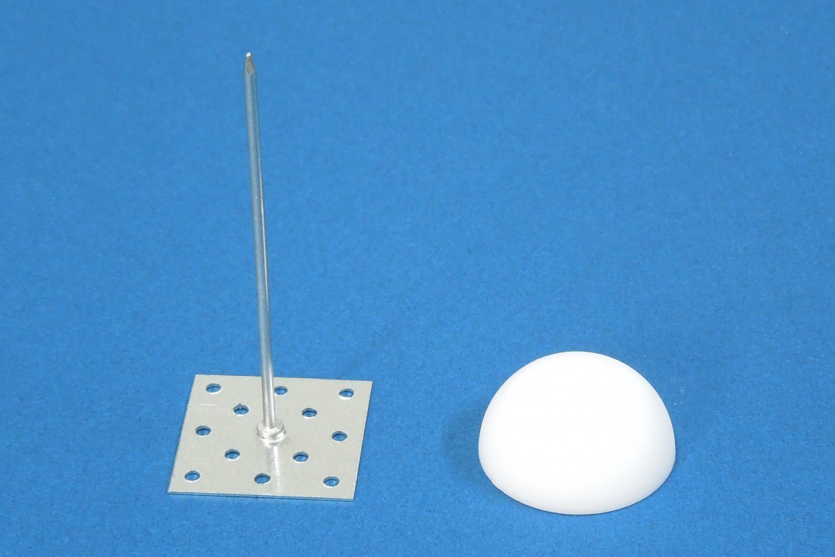 スピンドル鋲(硬質)は、グラスウールやロックウールなど繊維系断熱材の取り付け用の化粧鋲です。プレート(亜鉛めっき鋼板)寸法は、クギ全長が57mmの場合24mm角で厚みは、0.4mmです。プラスチックボタンワッシャー底部の材質はステンレスワッシャー24mm径です。プラスチックボタンの大きさは25mm径・12.7mm高さとなっております。