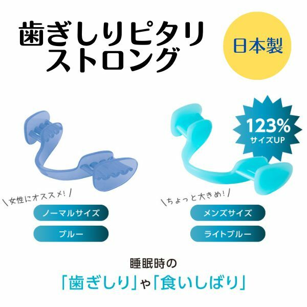 | 商品説明 | 歯ぎしりピタリ ストロング 歯医者さんと共同開発しました。 食いしばりは、歯を激しく摩耗し、ひどい知覚過敏や歯周病を引き起こします。 肩こりや頭痛、そしてなぜか腰痛やひざ痛まで引き起こし、全身の筋肉と神経を疲労させます。 また、歯ぎしり音はが周りに迷惑をかけるので後ろめたい気持ちになりがちです。 当商品は、寝る時にはめるだけで歯ぎしりや食いしばりを簡単に防ぐことができます。 噛み合わせ矯正ではないので、失敗が多い面倒な型どりが必要ありません。 寝る時にはめるだけで歯圧が吸収分散し、奥歯に負担をかけることなくピタっと止まります。 従来品よりも耐久性が約3倍アップ! 男性でもお使いいただけるストロングタイプになりました。 |
