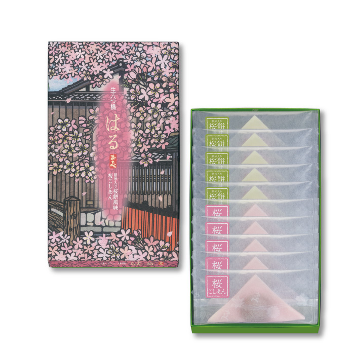 餅米入りの桜色の桜餅風味あんと、桜風味のこしあんを生八つ橋で包み込みました。