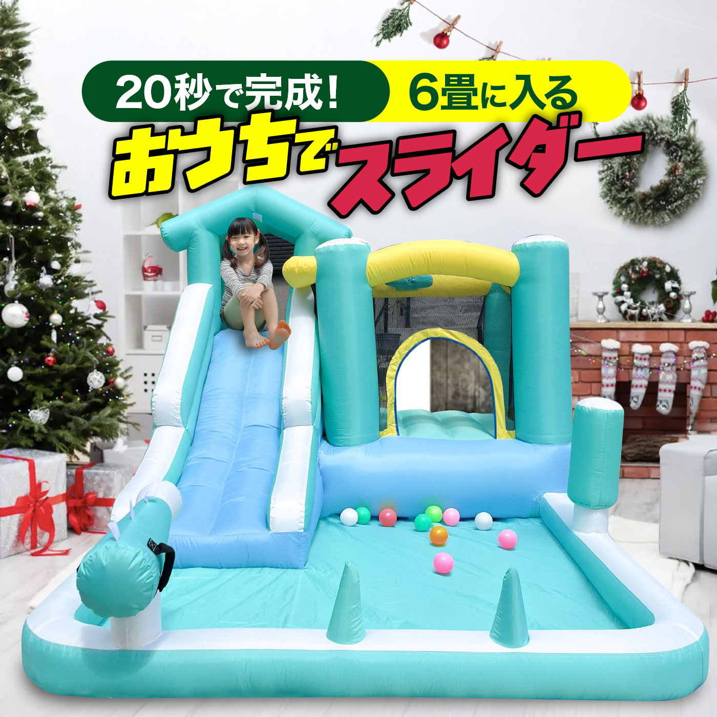 | ■子供心をくすぐるキッズ大喜びのエアー遊具! プレゼントにもおススメ! 日本の部屋にも設置できるオリジナルサイズ! 丸洗いOKなので夏はプールにして、夏以外は部屋でボールプールにして遊ぶなど一年中遊べます。 1時間遊んでも電気代はわずか10円※電気料金は標準的な平均値となります。 地域や契約内容によって異なります。ウォータースライダー用ホース付属でプールをさらに楽しめる事間違いなし! また、コンセントも日本対応2つ口ですのでどの家庭でも楽しめます。 付属のブロワーで空気を送り続ける仕様ですので破れにくく、安心・安全 破れた場合も付属の補修生地を軽く縫い合わせるだけで、簡単に補修ができます。 ■様々なシーンで大活躍! 自宅/駐車場/イベント/アウトドア |