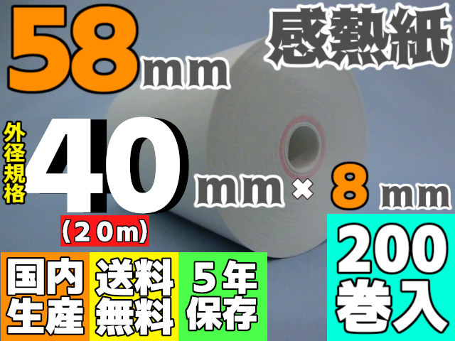 感熱ロール紙 58mm ×40×8/65μ (200巻入) モバイルプリンタ・SmartPay・楽天ペイ・Airペイ・PokePos・Square・Airレジ・UberEats・Airウェイト対応