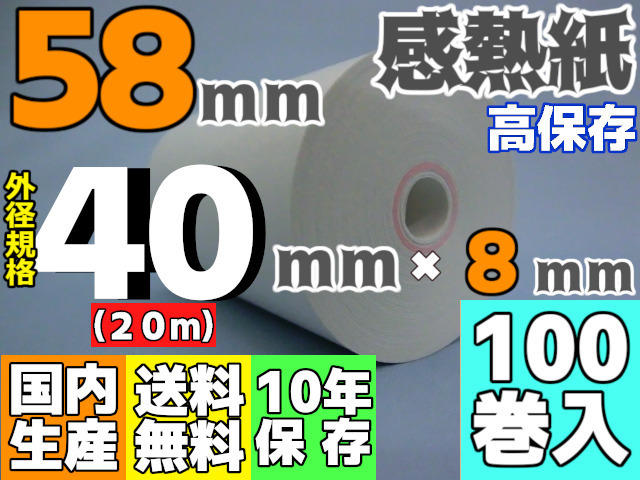 感熱ロール紙 58mm ×40×8/65μ 高保存 (100巻入) モバイルプリンタ・SmartPay・楽天ペイ・Airペイ・PokePos・Square・Airレジ・UberEats・Airウェイト対応