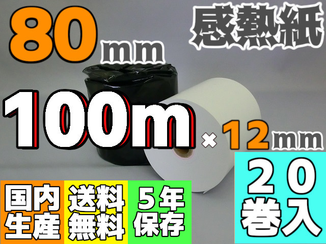 感熱ロール紙 80mm ×100m×12/65μ(20巻入)レジロール レシート プリンタ 検査機