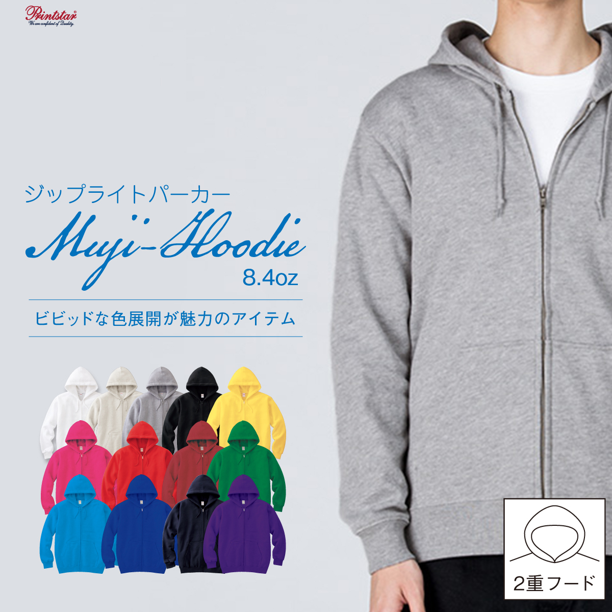 手頃な厚さと軽さ、価格、豊富なカラーバリエーション。ビビットカラーが印象的なジップアップタイプのパーカー。