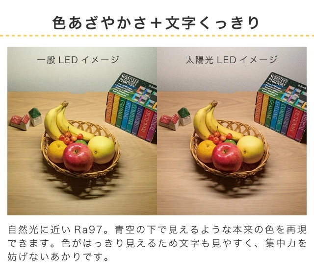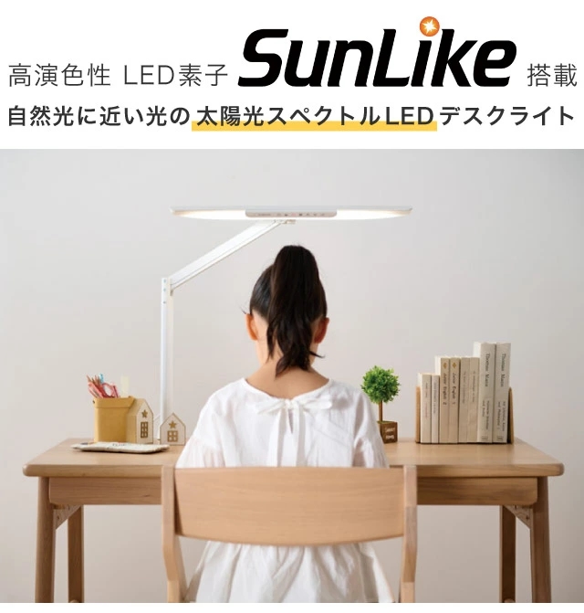 在宅学習や在宅勤務によって室内で長時間過ごすと目は疲れやすくなります。太陽光スペクトルLEDライトは、ブルーライト波長域を自然光に近いレベルまで削減し、目への負担を抑えたやさしいあかりです。