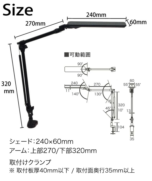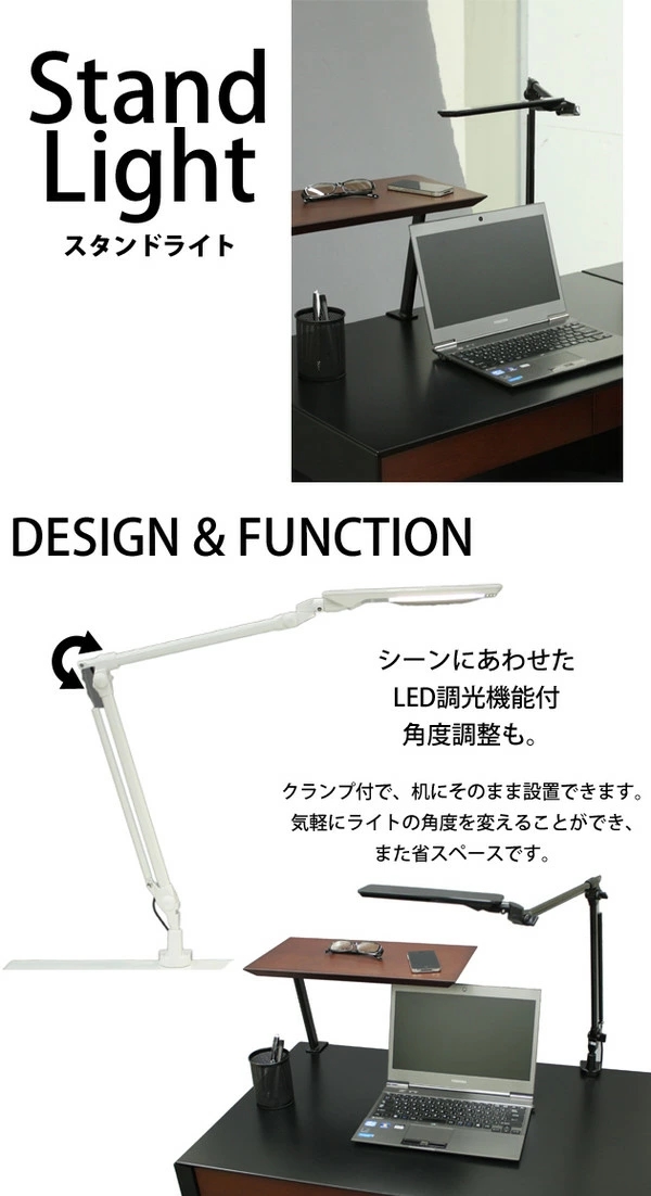 クランプ式でデスクに固定できるので、気軽にライトの位置を変えることができて便利です。