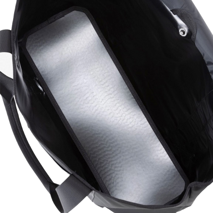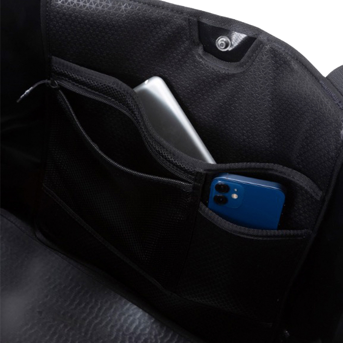 メイン素材は、環境に配慮した1000デニールのリサイクルポリエステルを一部使用し、TPEファブリックラミネートを施した高強度の生地を採用。濡れや汚れに強く、重い荷物でも気兼ねなく収納できる高い耐久性を備えています。