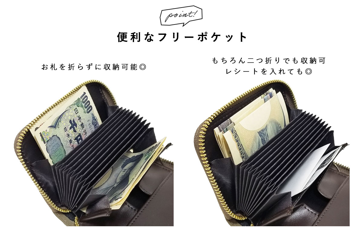 便利なフリーポケットはレシートやお札の収納に◎お札は折らずに収納できます。