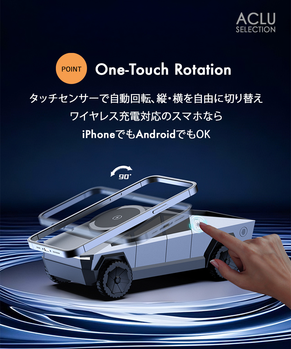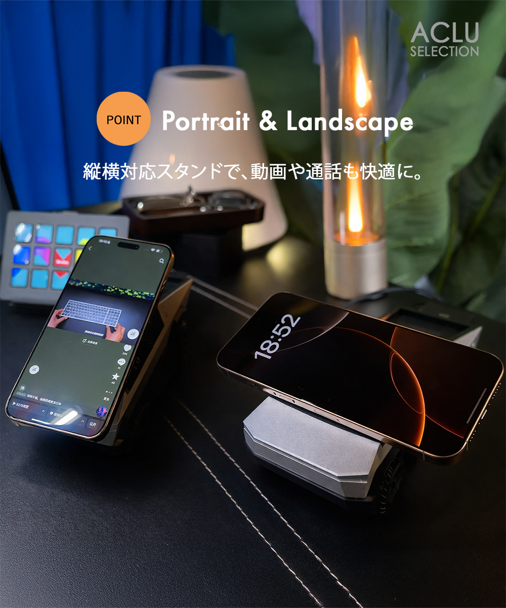 【POINT】タッチセンサー式・自動回転スタンド ワンタッチで縦・横を自由に切り替え。 縦置き・横置きの両方に対応し、シーンに合わせて快適に使用できます。