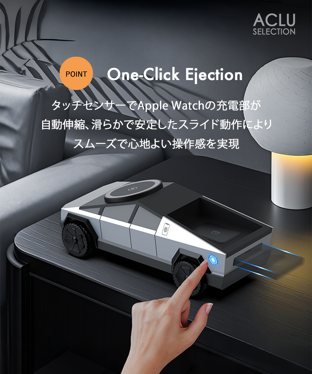 【POINT】タッチセンサー式・自動伸縮構造 タッチセンサーによりApple Watch充電部が自動で伸縮。 滑らかで安定したスライド動作により、心地よい操作感を実現。
