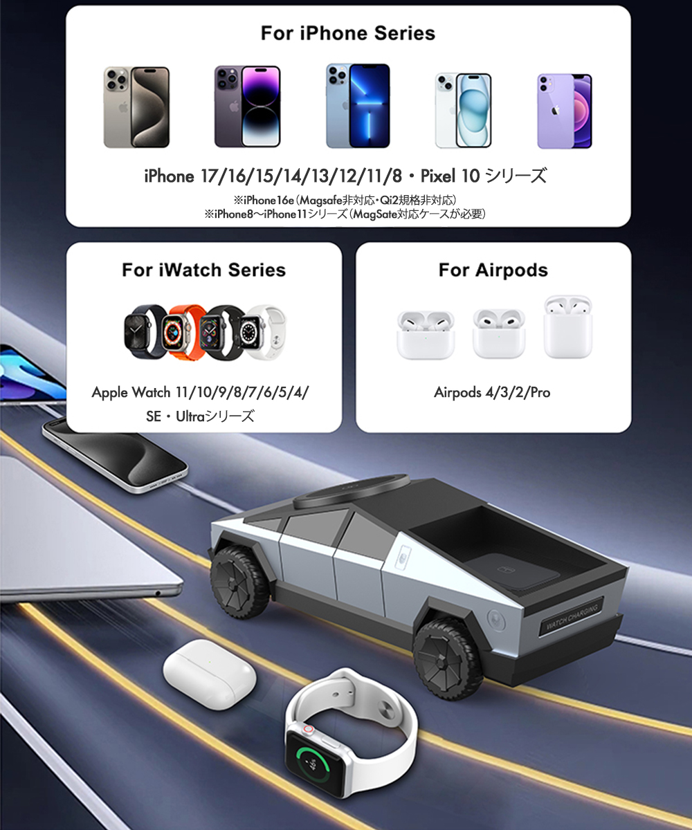 【POINT】幅広い機器に対応 iPhone13から最新の iPhone17シリーズを含む、Qi2対応のAndroidスマートフォン(Pixel 10 / 10 Pro / 10 Pro XL 10 Pro Fold)に高速充電が可能です。万が一 Qi2 に非対応の機種であっても、従来規格の Qi による充電がご利用いただけます。