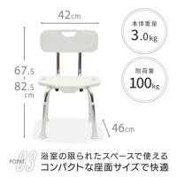 ・時間:約10-20分説明 ●使いやすさを追求した優しい便利なチェア。 ●座面をひとまわり小さくしたコンパクト設計。 ●背部に移動時便利な持ちやすい取っ手付き。 ●座部に立ち上がり時に便利な取っ手付き。 ●座部の表面は滑りにくい凹凸加工。 ●とても軽いアルミフレーム採用。 ●座部に排水穴があり、水がたまらないので清潔。 ●脚部の先端は滑りにくいゴムキャップを採用。 ●座部と背部に使い心地のよいクッションマット付。 ●使う人に合わせて座部高さ7段階調節可能。 ●座面高さ:35.5~50.5cm ●使用体重制限:最大100kg ●品(時間:約10-20分)