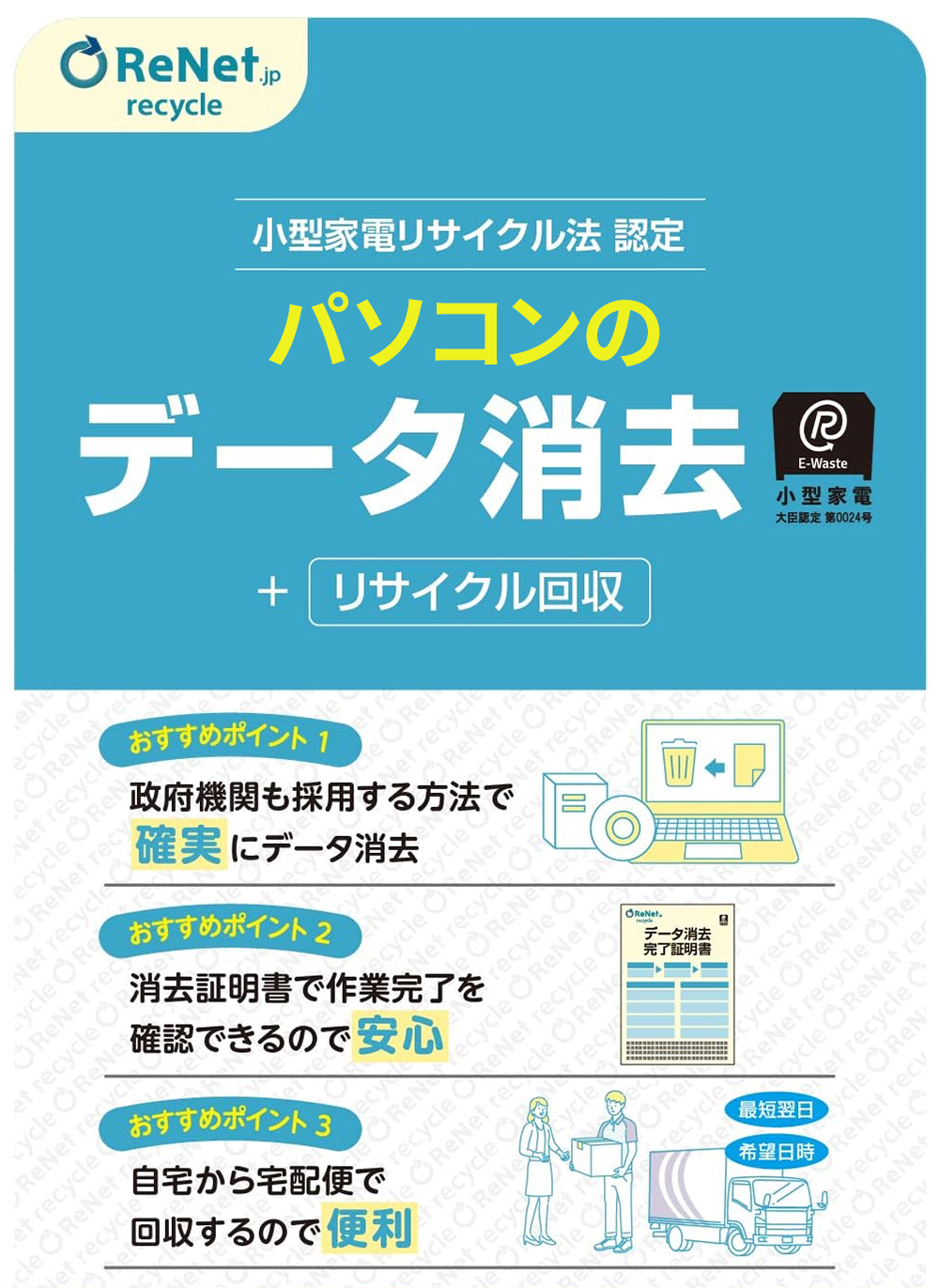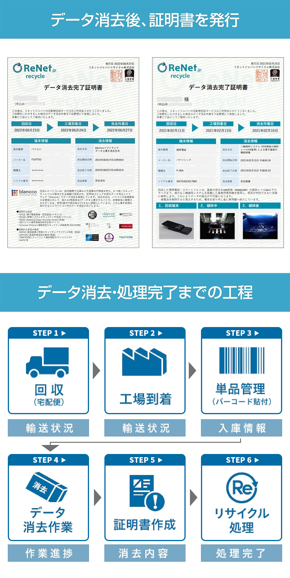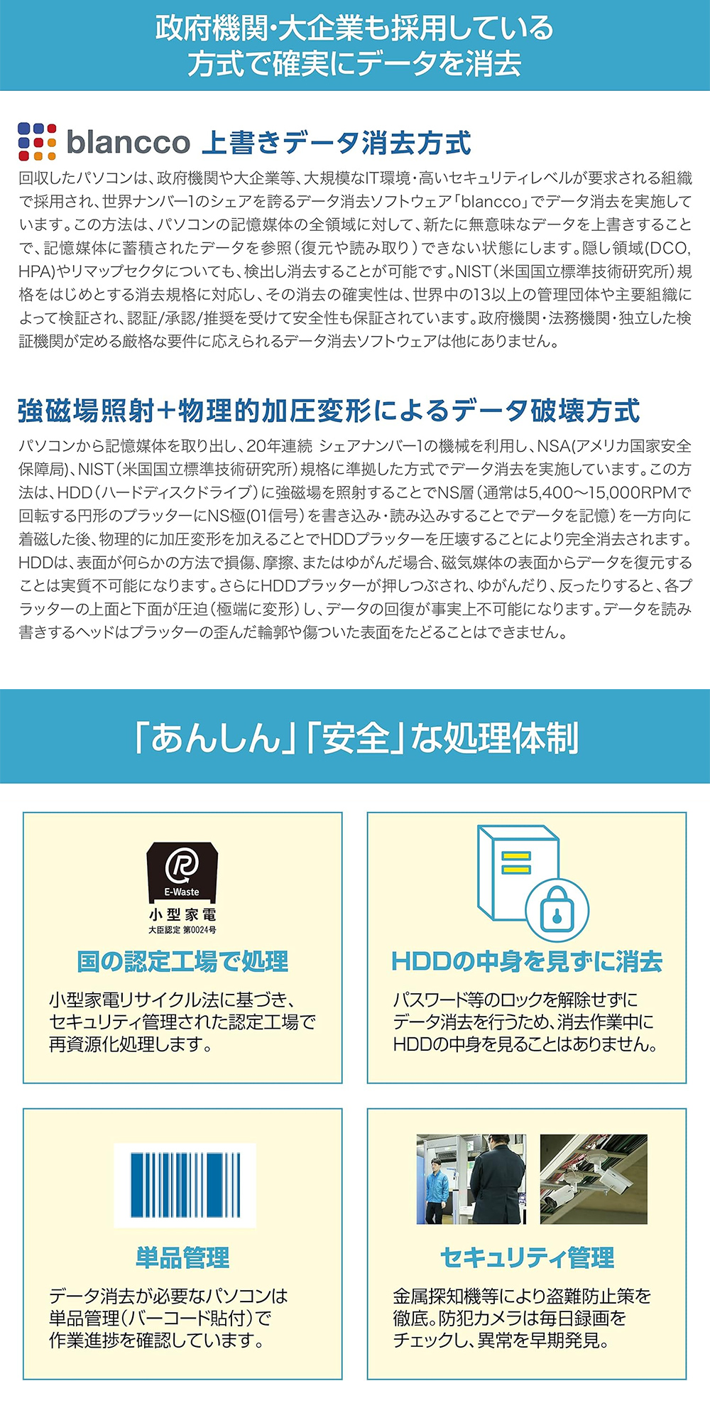 ・データ消去は、小型家電リサイクル法の認定工場で、政府機関・大企業も採用している方法で行い、「データ消去証明書」を発行します。
