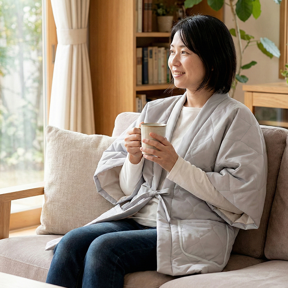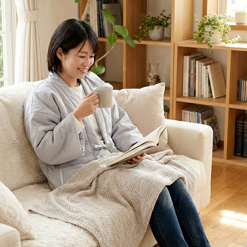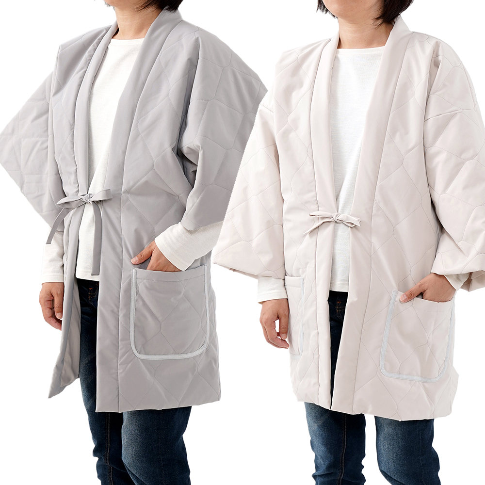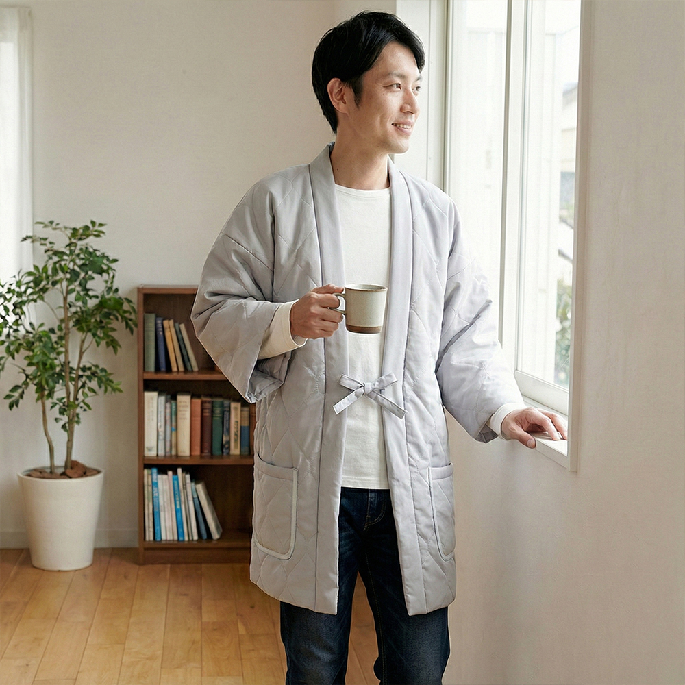 ゆったりとしたサイズで厚すぎない作りなので、冬のスウェットやパーカー、ニットを着た上にも羽織ることができ、部屋の温度に合わせてインナーでも調整しやすい使い勝手の良いはんてんです。