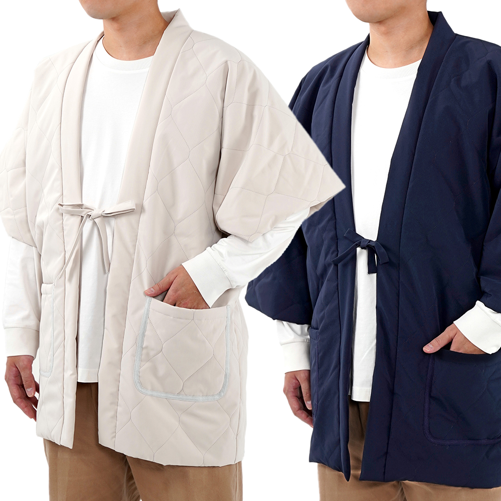 ゆったりとしたサイズで厚すぎない作りなので、冬のスウェットやパーカー、ニットを着た上にも羽織ることができ、部屋の温度に合わせてインナーでも調整しやすい使い勝手の良いはんてんです。