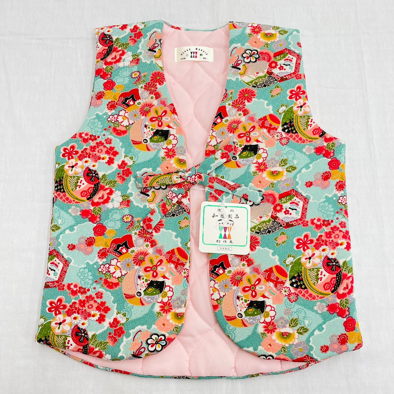子供 キッズ ポンチョ ちゃんちゃんこ かわいい 袖なし 毬 マリ 水色 ブルー 女の子 90cm 女児 和柄 半天 日本製 ポリエステル あったか スリーパー