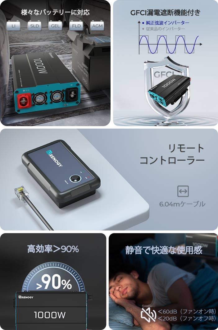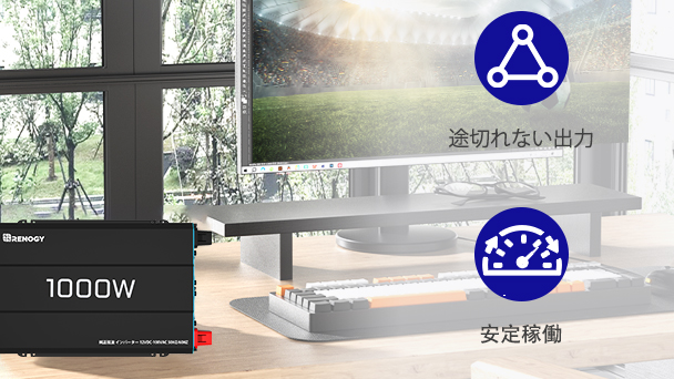 【主なご利用場面】RENOGYの正弦波インバーターを通して、扇風機、電気毛布、照明などのあらゆる家庭用電子機器(合計の定格消費電力1000W以下)に電力の供給が可能です。車中泊やキャンプ地などの電源が無い屋外での使用に最適です。また災害時に照明をつける、電気毛布で暖を取るなど、必要最低限の電子機器のご利用に向いています。