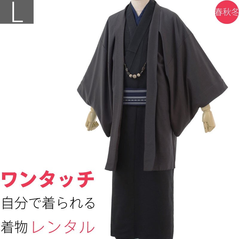 黒色の着物と、グレーの羽織のセットです。生地は紬(つむぎ)です。着物と羽織を異なった同系色で組み合わせており、さりげなくおしゃれな印象で着こなせます。
