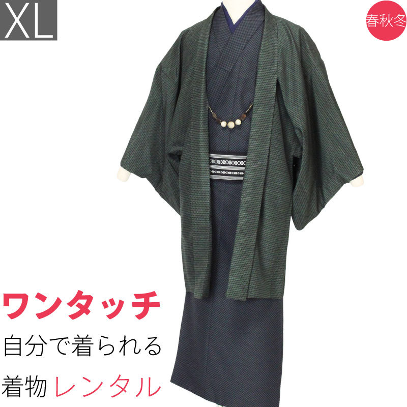 着物が濃紺に市松柄(チェック柄)で、羽織が緑に長七宝柄のおしゃれ紬のセットです。パーティーやイベントの他、旅行・散策などカジュアル用途におすすめです。