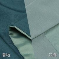爽やかな緑色の着物に、少し青みの掛かった薄緑の羽織を合わせました。紬です。お出掛けやパーティー、七五三のお父さんの着物などにご利用頂けます。