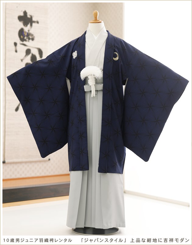 (10歳 男の子 ジュニア紋付袴レンタル 「ジャパンスタイル」 上品な紺地に吉祥モダン)