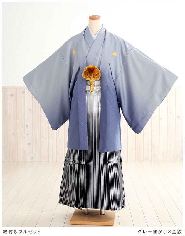 (紋付袴レンタル グレーぼかし×金紋/男性着物/フルセット)