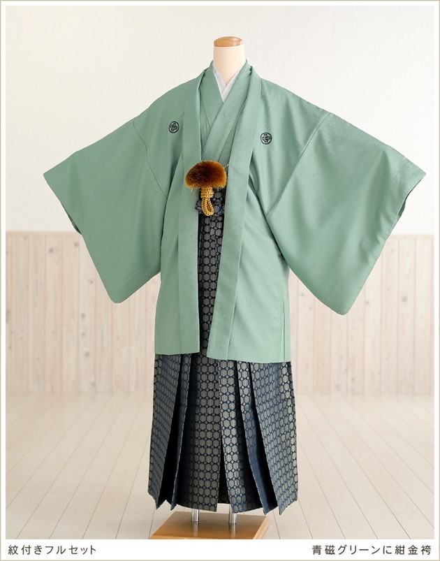 (成人式用 紋付袴レンタル 青磁グリーンに紺金袴/男性着物/フルセット)