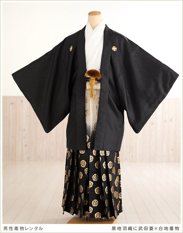 (成人式用 紋付袴レンタル 黒地羽織に武田菱×白地着物/男性着物/フルセット)