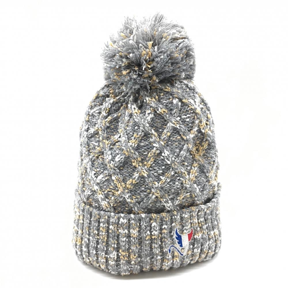 クランク ニット帽 グレー×白 裏ボア アクリル混 ボンボン付 FREE ゴルフウェア CLUNC(超美品)
