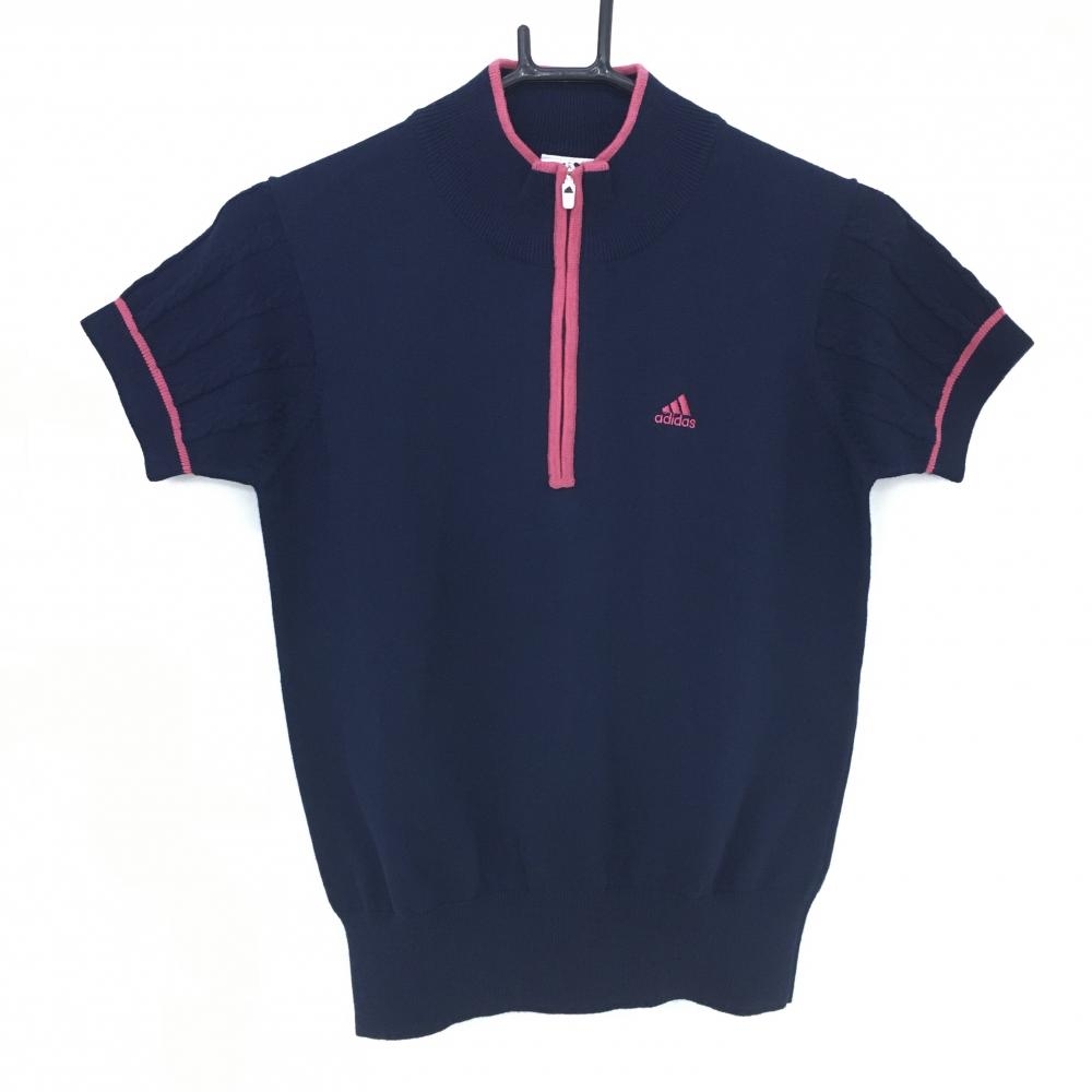 アディダス 半袖ハイネックセーター ネイビー×ピンク ハーフジップ 袖ケーブル編み レディース S/P ゴルフウェア adidas(美品)