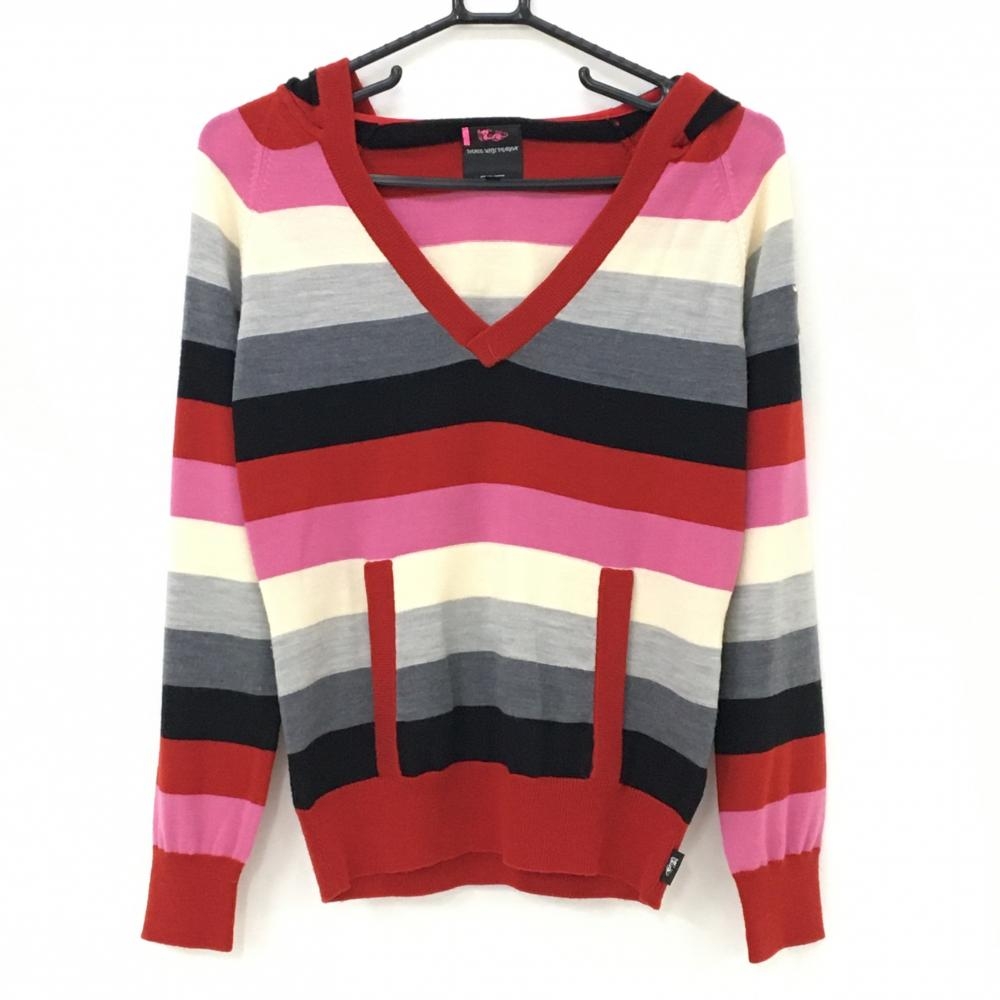 ダンスウィズドラゴン フード付きセーター レッド×ネイビー×グレー Vネック レディース 2(M) ゴルフウェア Dance With Dragon