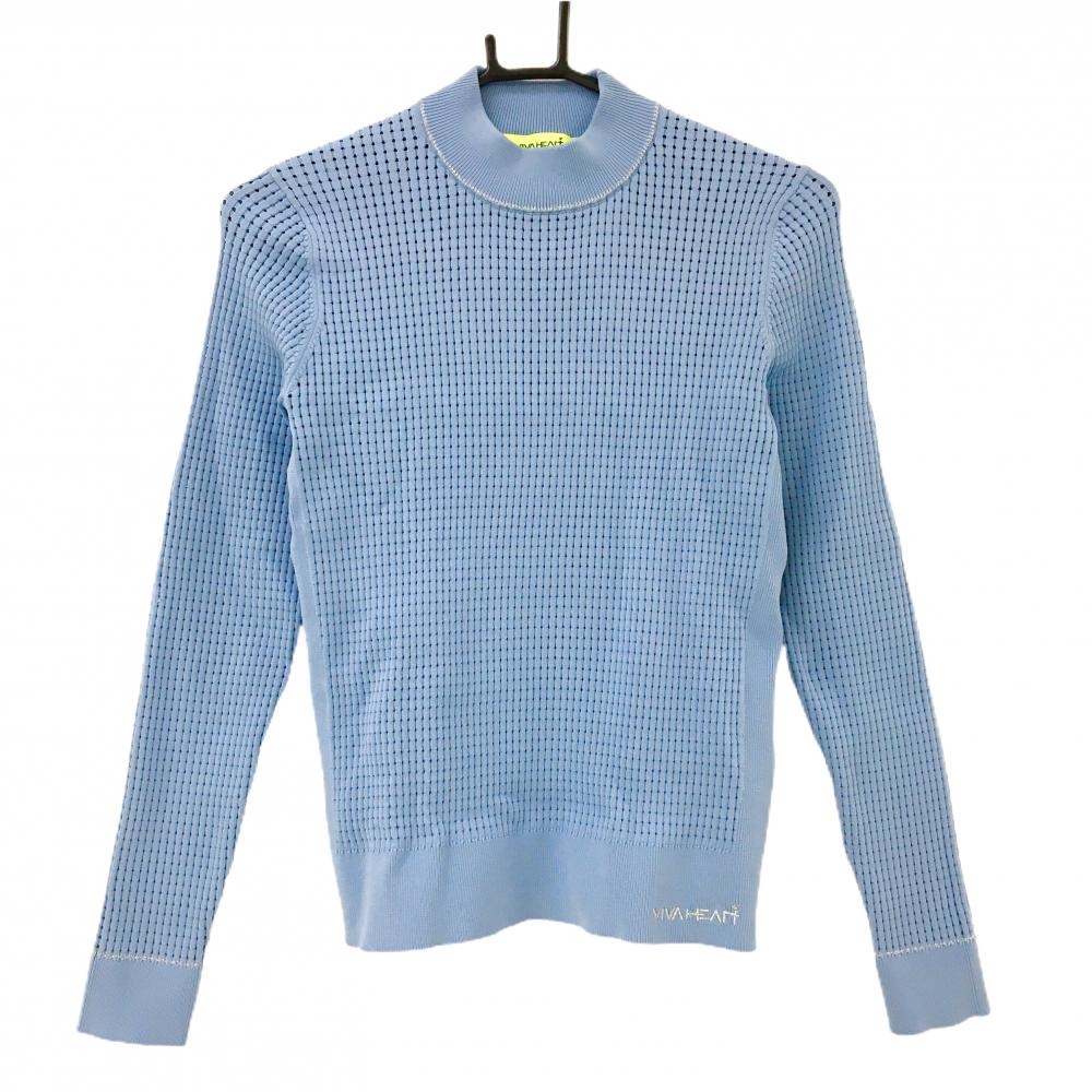 【超美品】ビバハート ハイネックセーター くすみブルー 透かし編み シルバーライン 裾ロゴ レディース 40 ゴルフウェア VIVA HEART/SALE価格
