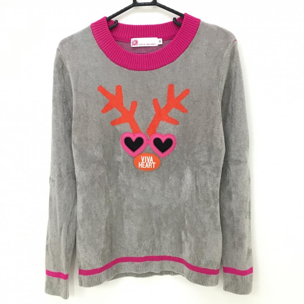 【美品】ビバハート セーター グレー×ピンク ハートサングラス 表起毛 ニット ウール混 レディース 42(L) ゴルフウェア VIVA HEART