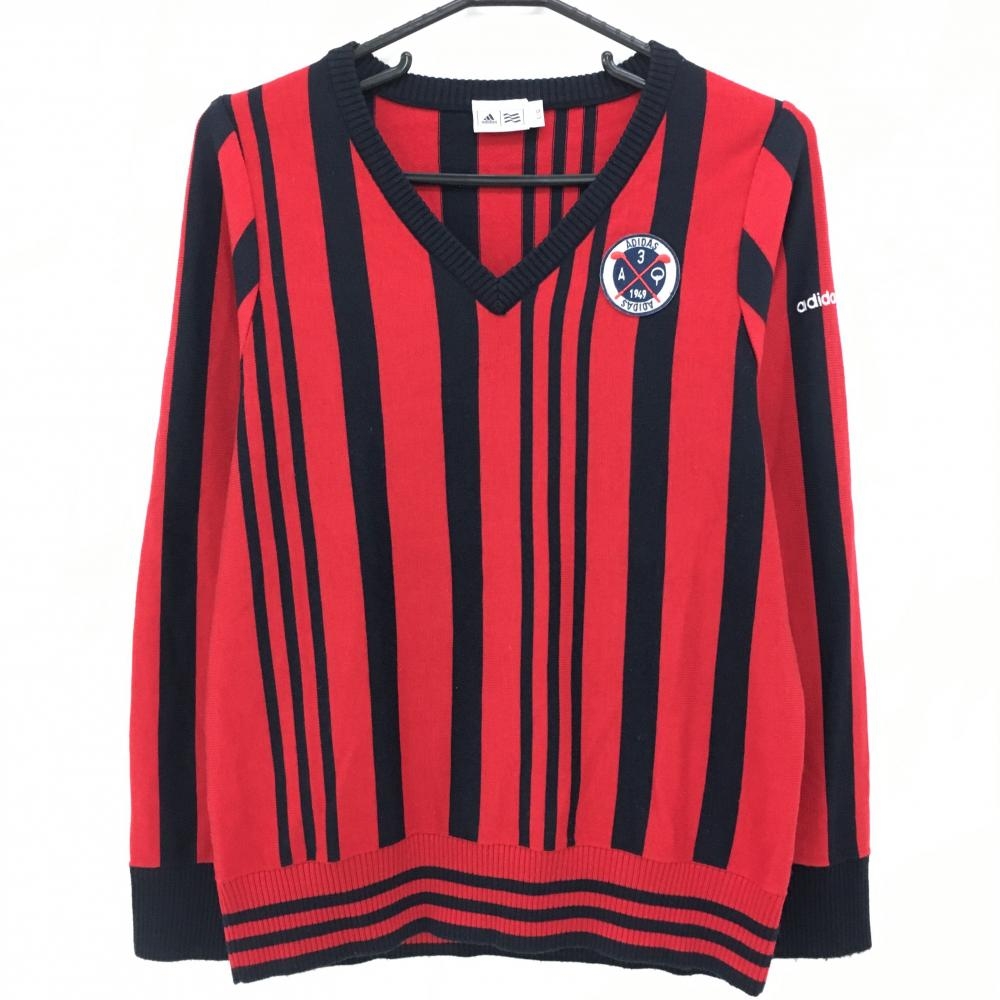 【美品】アディダス セーター レッド×ネイビー ストライプ Vネック ウール混 ニット レディース L/G ゴルフウェア adidas