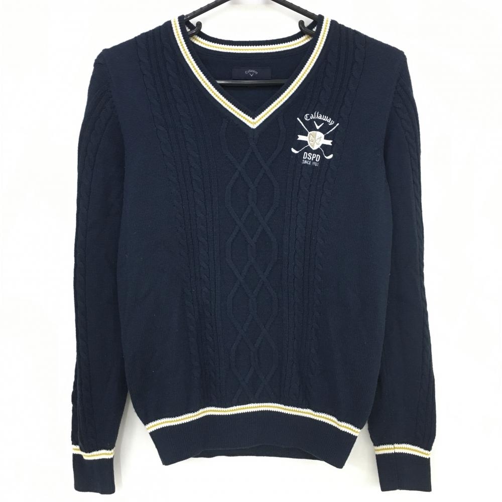 【美品】キャロウェイ セーター ネイビー×白 一部ケーブル編み ニット ウール混 Vネック レディース M ゴルフウェア Callaway