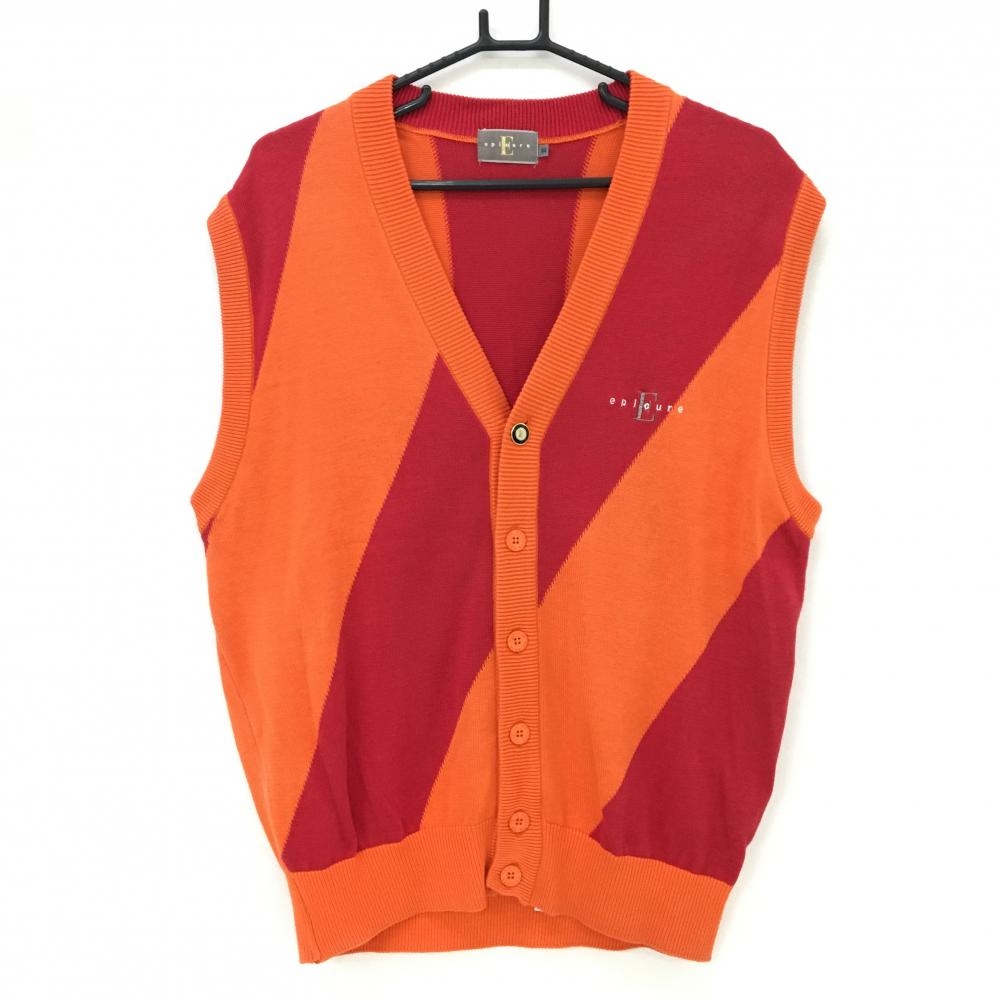 【美品】エピキュール ニットベスト レッド×オレンジ 前面斜めボーダー コットン混 メンズ III ゴルフウェア epicure