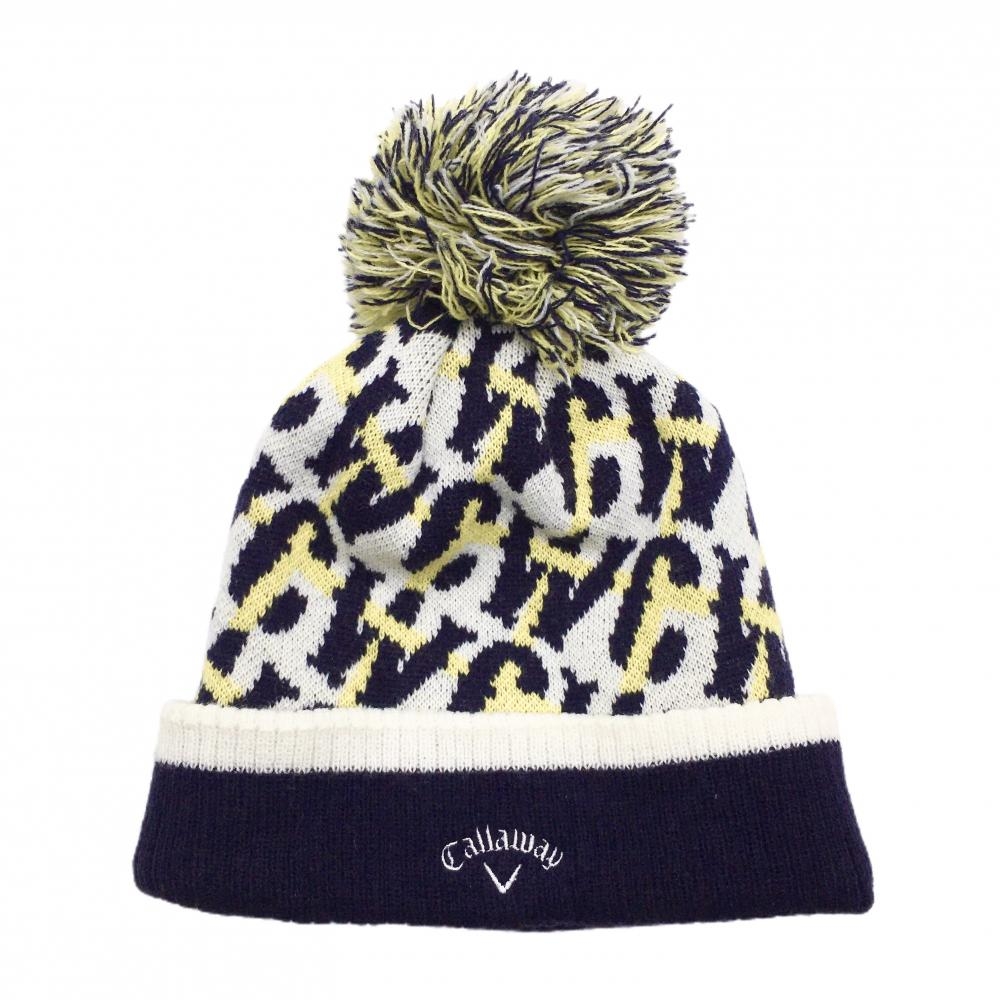 【超美品】キャロウェイ ニット帽 白×ネイビー レオパード柄 ボンボン付き アクリル100% FR ゴルフウェア Callaway