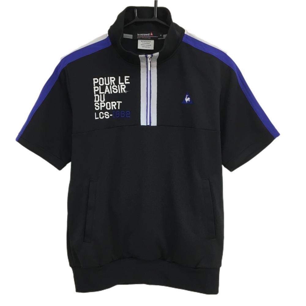 ルコックゴルフ 半袖ブルゾン 黒×白×ブルー ハーフジップ 肩ライン メンズ M ゴルフウェア le coq sportif