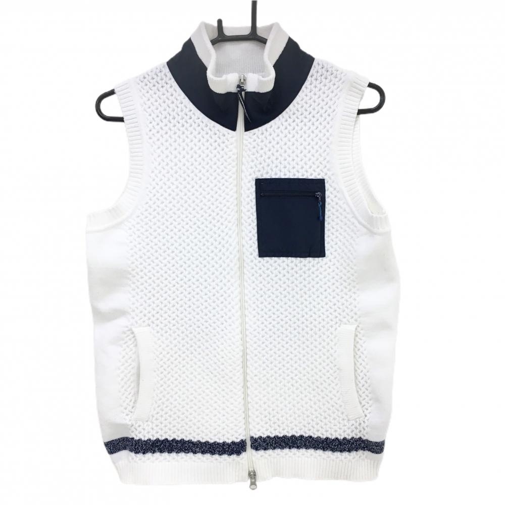 【美品】ロサーセン ニットジップベスト 白×ネイビー 凹凸編み コットン混 メンズ M ゴルフウェア Rosasen