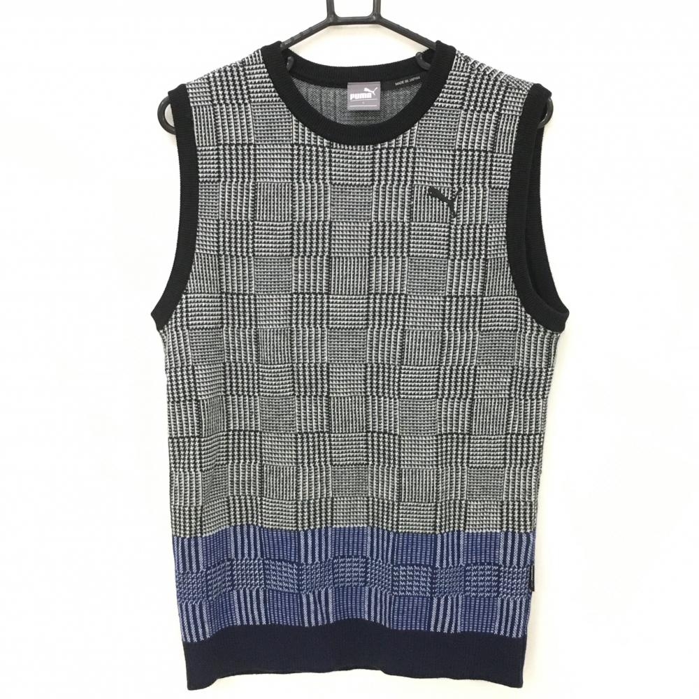 【超美品】プーマ ニットベスト 黒×白×ブルー グレンチェック調 ウール混 メンズ L ゴルフウェア PUMA