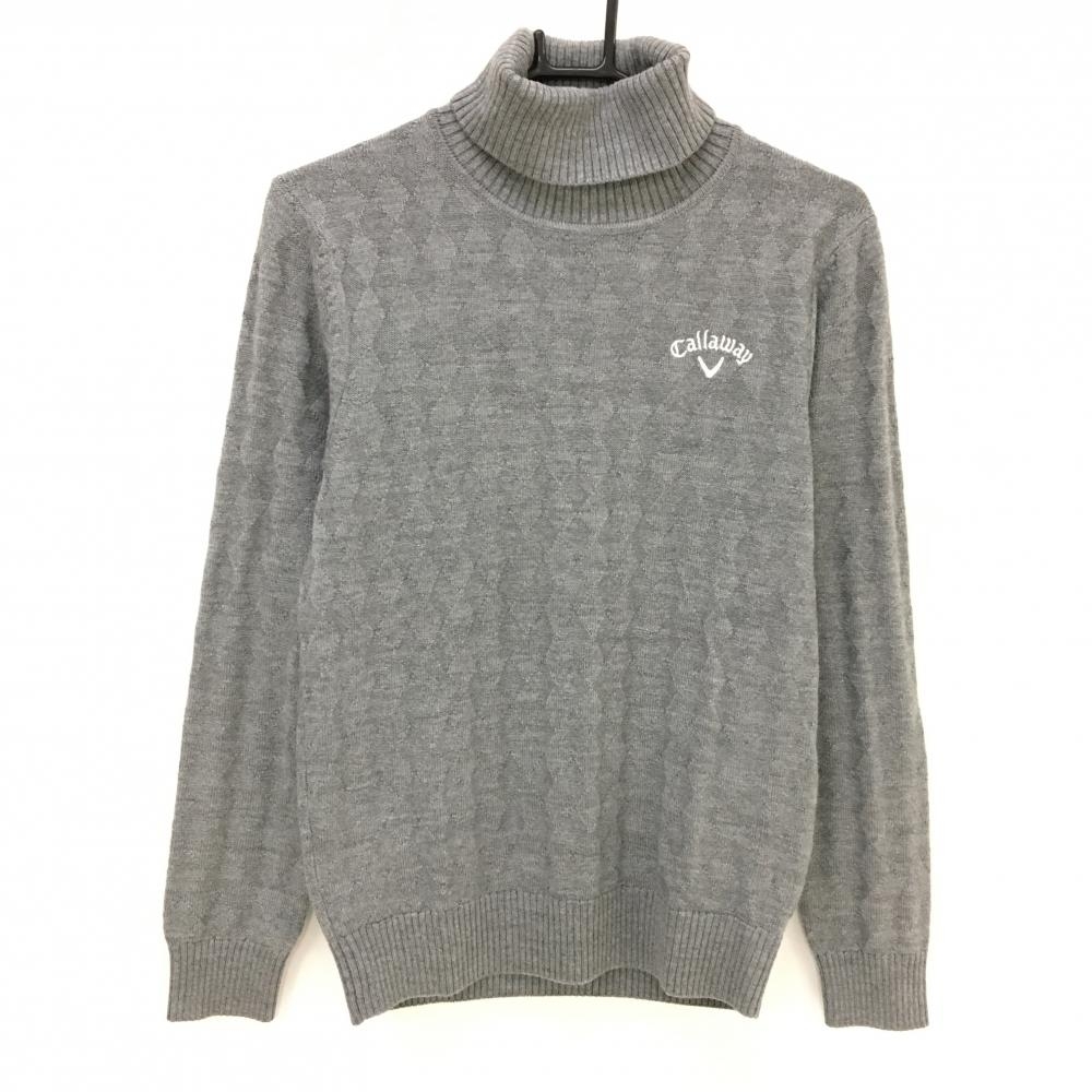 【美品】キャロウェイ タートルネックセーター グレー ロゴ白 ダイヤ柄編み ウール混 ニット メンズ M ゴルフウェア Callaway
