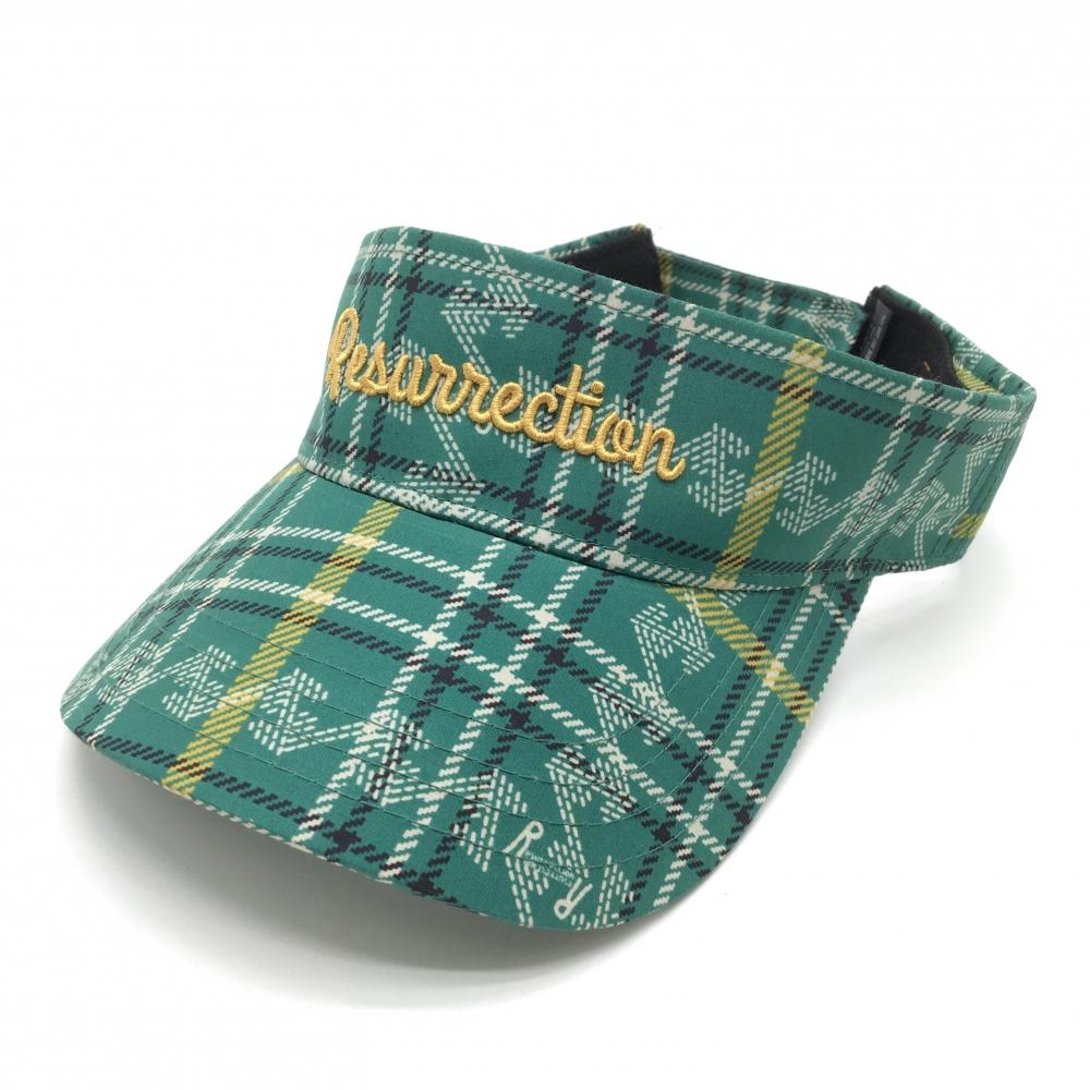 【超美品】レザレクション サンバイザー グリーン×白×イエロー チェック ロゴ刺しゅう フリーサイズ ゴルフウェア Resurrection