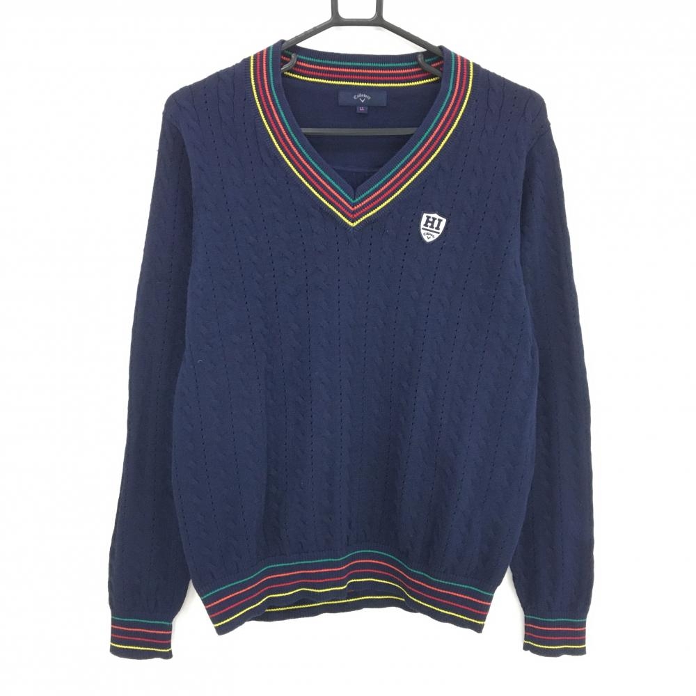 【美品】キャロウェイ セーター ネイビー ケーブル編み コットン混 ネックライン ニット レディース LL ゴルフウェア Callaway