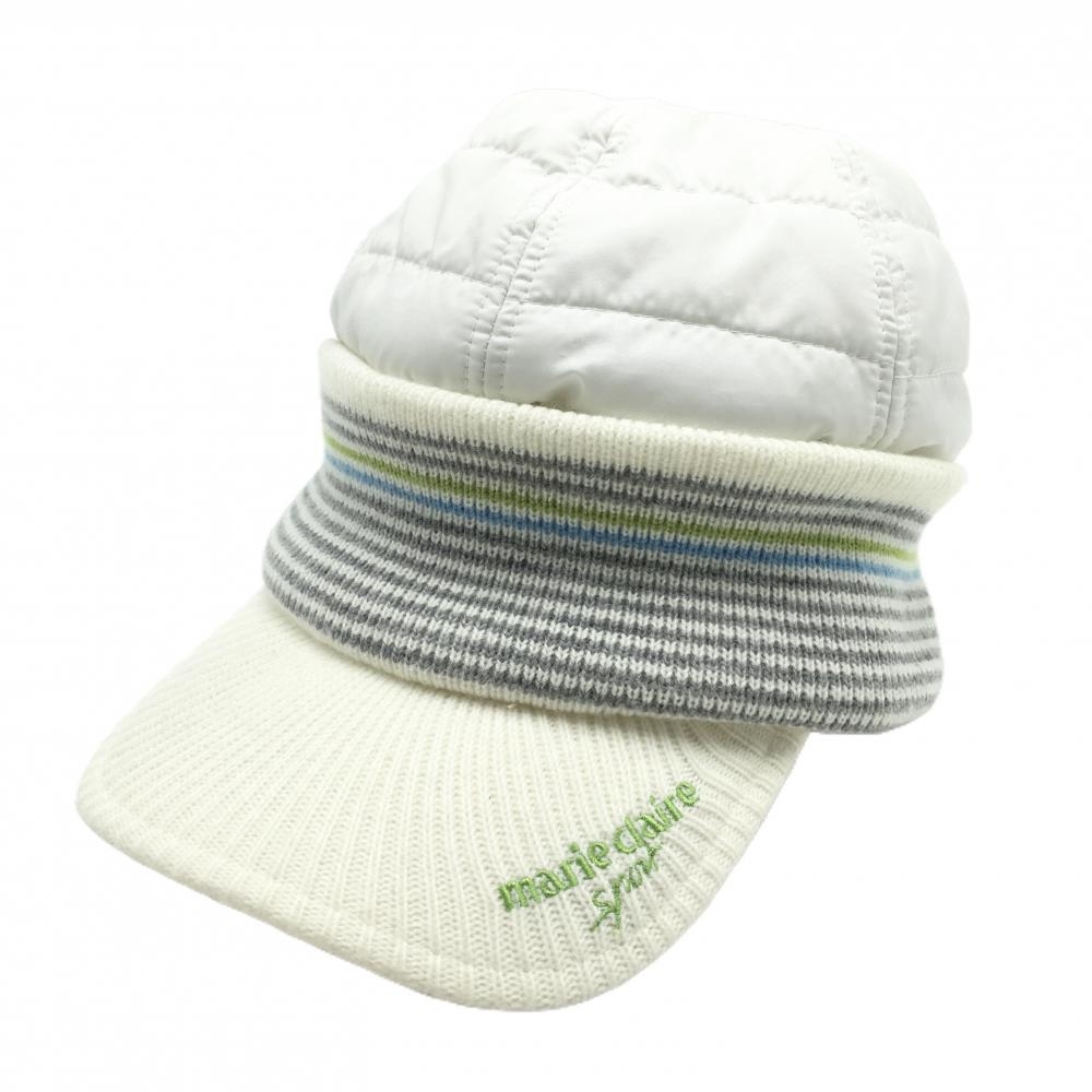 【超美品】マリクレールスポール 中綿つば付きニット帽 白×アイボリー×グレー ロゴ刺しゅう 裏フリース ゴルフウェア marie claire